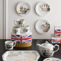 24金の4種類の王冠が4枚のデザート皿にそれぞれプリントされたセットです。ユニオンジャックがデザインされたギフトBOX入り4アソートデザイン4枚セット 径20c