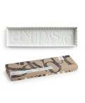 食べ物とデザインの美しいコンビネーション。セイヴァーシリーズは清潔な白い磁器にエンボスされたアルファベット文字が特徴のシリーズです。シンプルながらビンテージな風合いが特徴です。antipastoの文字がエンボスデザインされた、リムのあるレクタングルトレイですサイズ:10×33.5cm ギフトBOX入り
